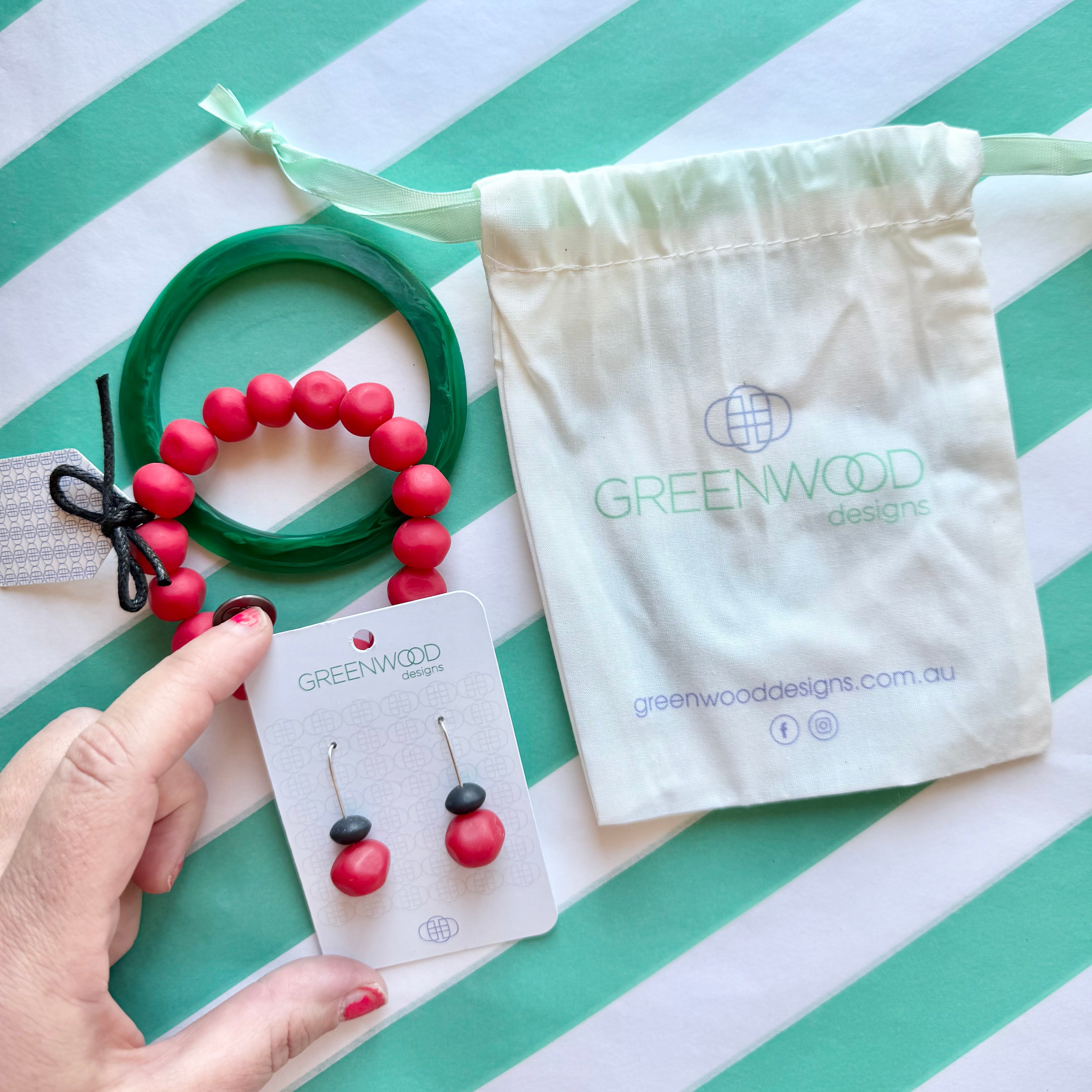 Add a pop of colour and fun with this jewelry gift bundle! It includes a resin organic bangle, a rock bracelet and a pair of coordinating rock dangle earrings — the perfect mix of bold and playful. Designed for easy, everyday wear, these pieces are as durable as they are eye-catching. Ideal for teacher gifts, Kris Kringle, or a little treat for yourself. Comes packaged in a lovely gift bag, ready for gifting!