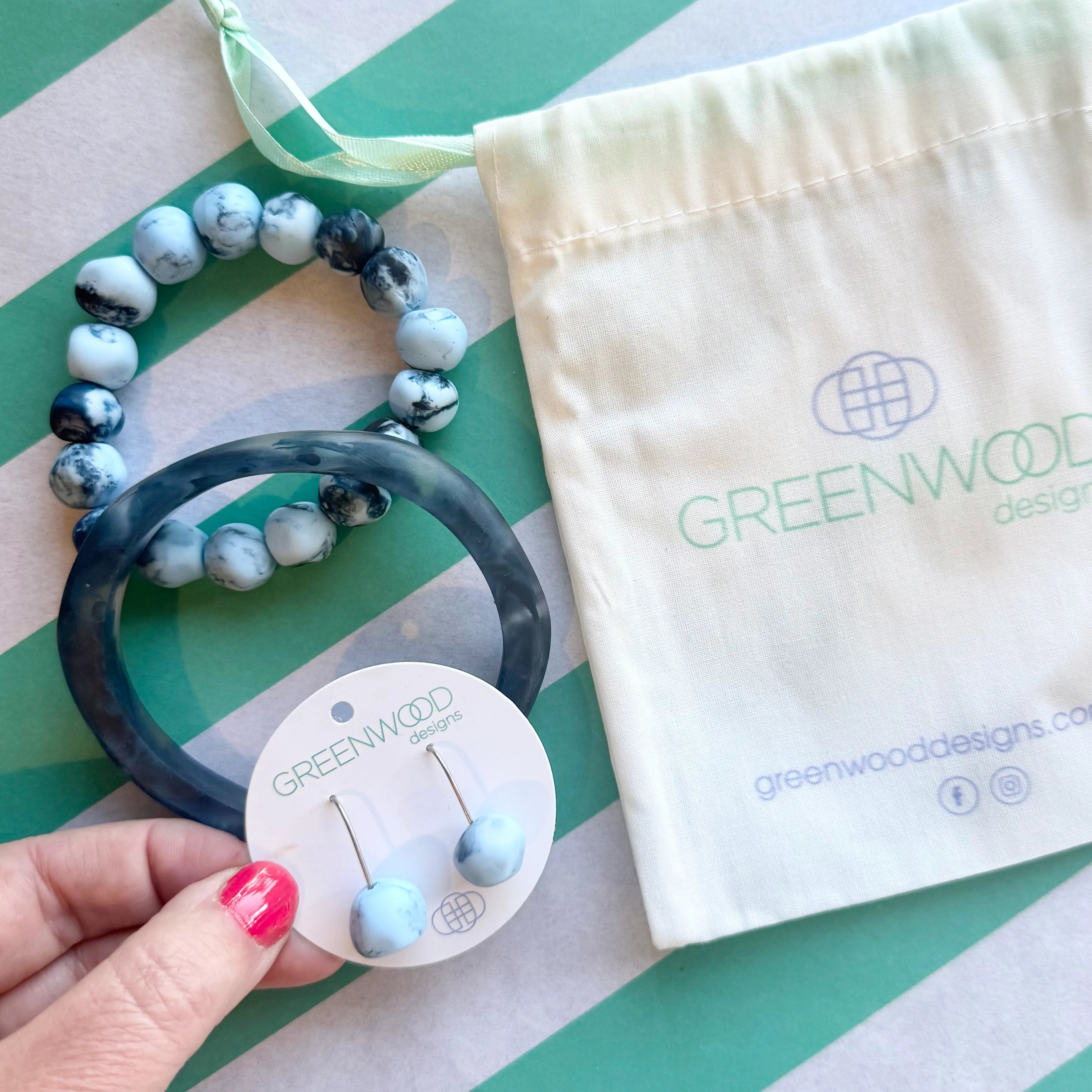 Turn up the style with this marbled trio! π This gift bundle features a wave resin bangle, a rock bracelet, and matching rock dangle earrings β all with a stunning marbled design. Available in a range of colours, itβs perfect for Kris Kringle, teacher gifts, or a little treat for yourself. Each bundle comes packaged in a cute calico bag, ready to gift (or keep β we wonβt judge!).