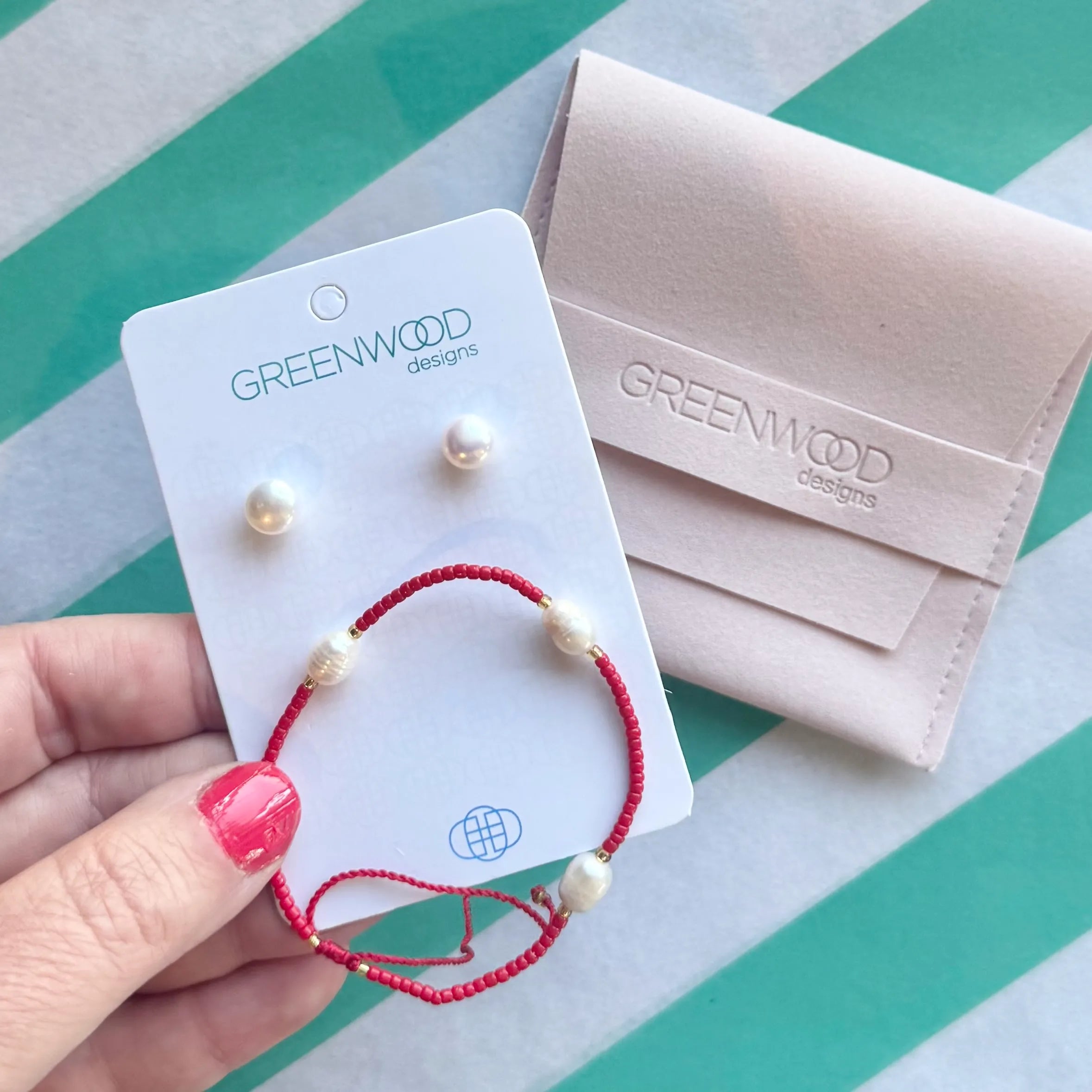 A touch of elegance made easy — this jewellery gift bundle includes a pair of classic small pearl studs and a red beaded adjustable bracelet featuring three dainty pearls. Simple, stylish, and effortlessly wearable, it’s a beautiful choice for teacher gifts, Kris Kringle, or a special treat for yourself. Comes packaged in a lovely gift bag, ready for gifting!