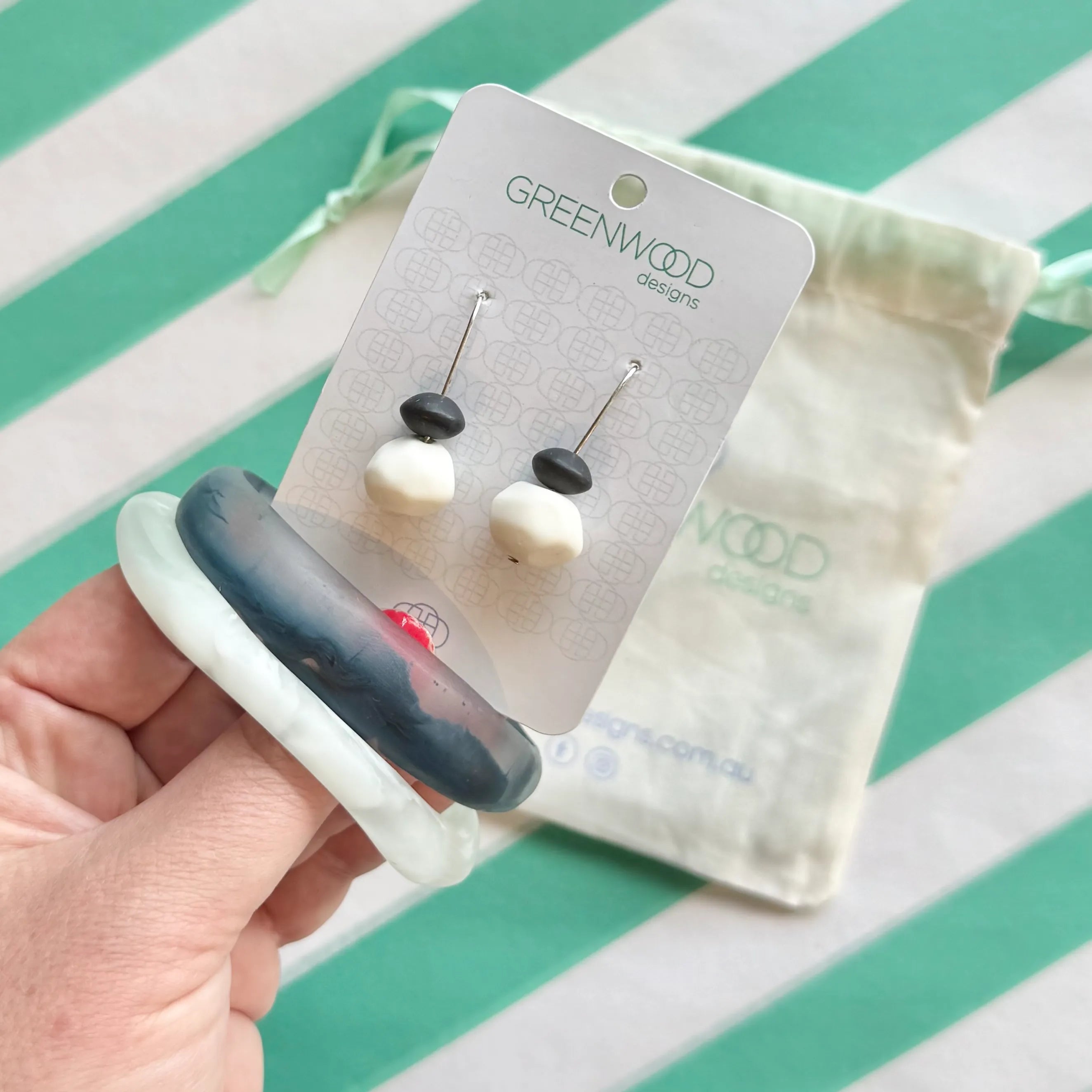 Add a pop of colour and fun with this jewellery gift bundle! It includes two resin bangles in different shapes and a pair of coordinating rock dangle earrings — the perfect mix of bold and playful. Designed for easy, everyday wear, these pieces are as durable as they are eye-catching. Ideal for teacher gifts, Kris Kringle, or a little treat for yourself. Comes packaged in a calico gift bag, ready for gifting!