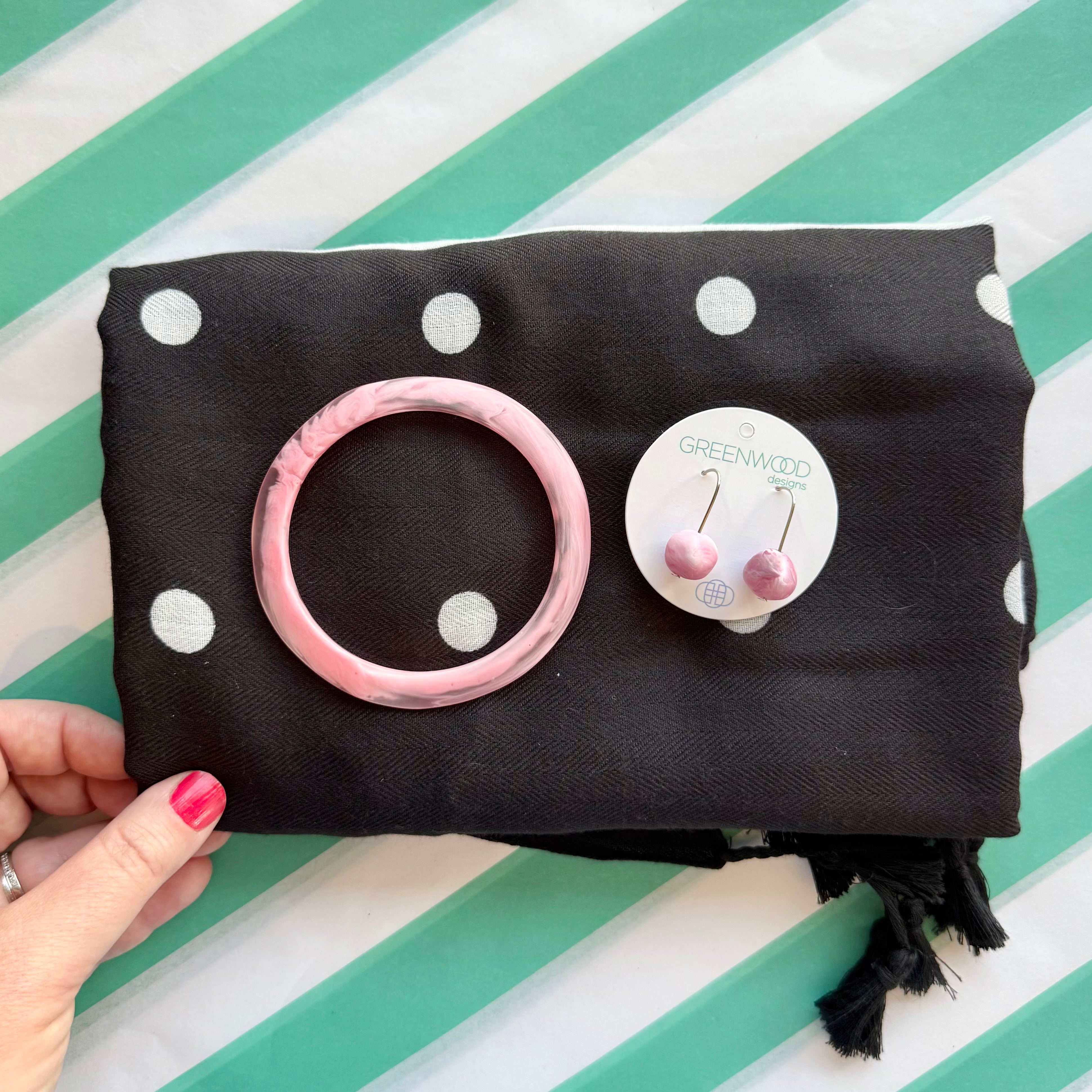 This beautifully curated pack includes a scarf, resin dangle earrings and bracelet, wrapped in tissue, ready to give to that special someone.