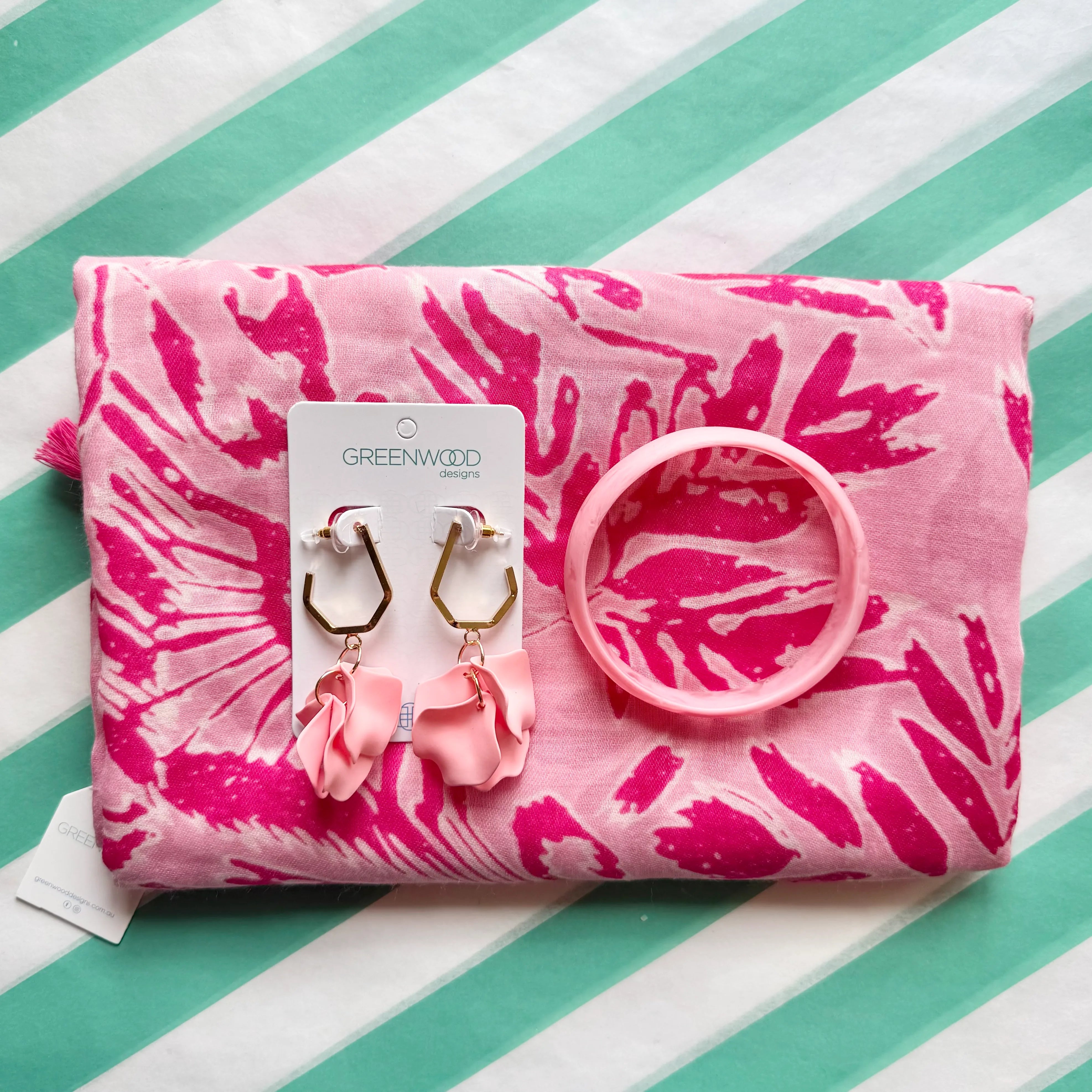 lightweight scarf, pink scarf, abstract floral scarf, scarf with tassels