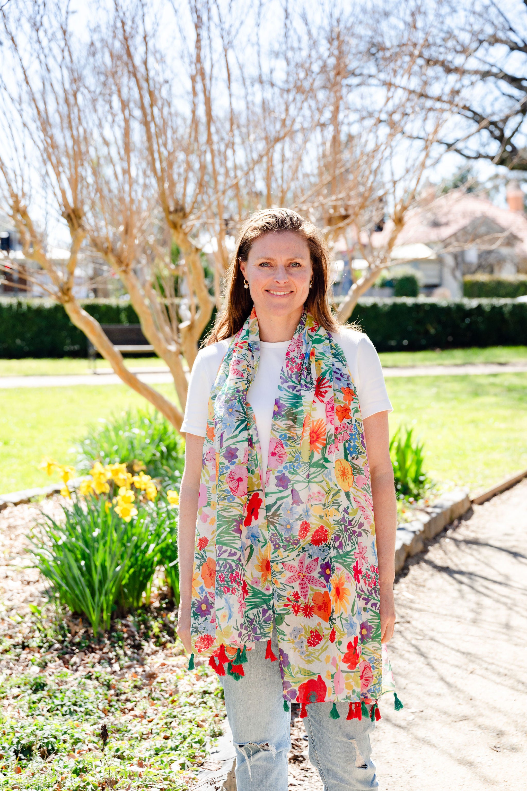 Introducing April, the scarf that’s as fresh and vibrant as a spring garden! This lightweight beauty is adorned with a delightful floral design bursting in bright colours—think pink, green, purple, yellow, and red—all on a crisp white background. And just when you thought it couldn't get any better, April finishes off with playful red and green tassels that add a touch of whimsy to this masterpiece. Whether you're out for a stroll or just want to add a pop of colour to your day, April has got you covered (literally!).