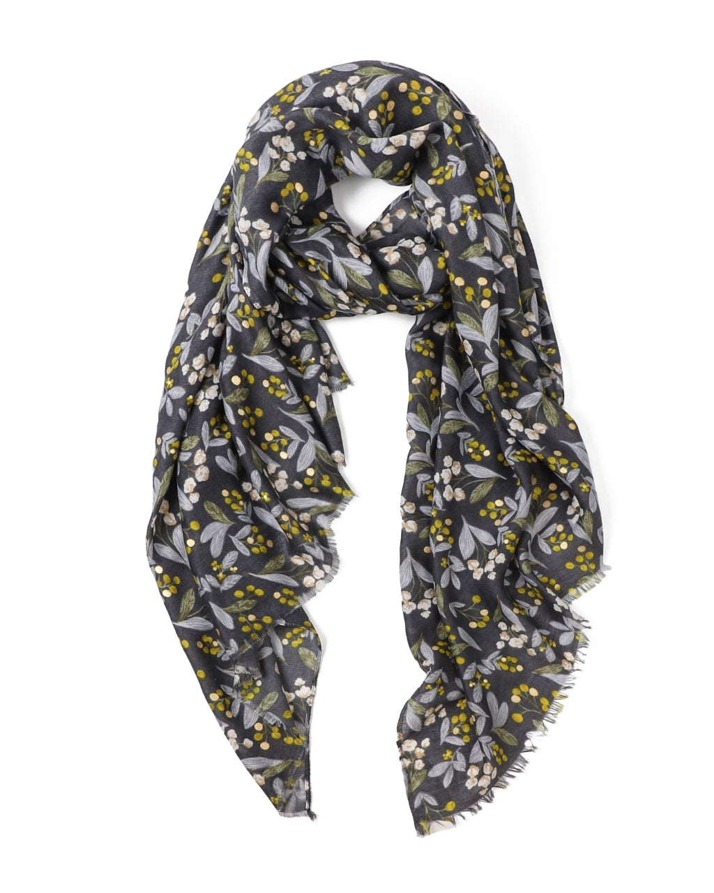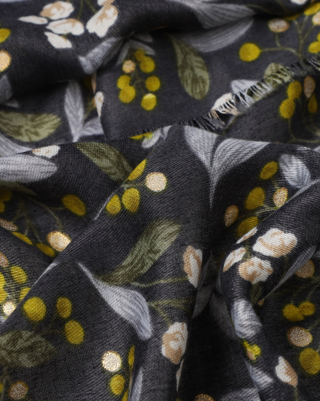 Say hello to Cally, your autumn-winter floral delight! With a charming mix of blue, green, white, and lime-yellow blooms on a muted grey background, Cally is all about bringing warmth and whimsy to cooler days. The gold highlights add a touch of sparkle, while the softly fringed ends keep things effortlessly elegant. Perfect for those who love a hint of glamour with their cosiness!