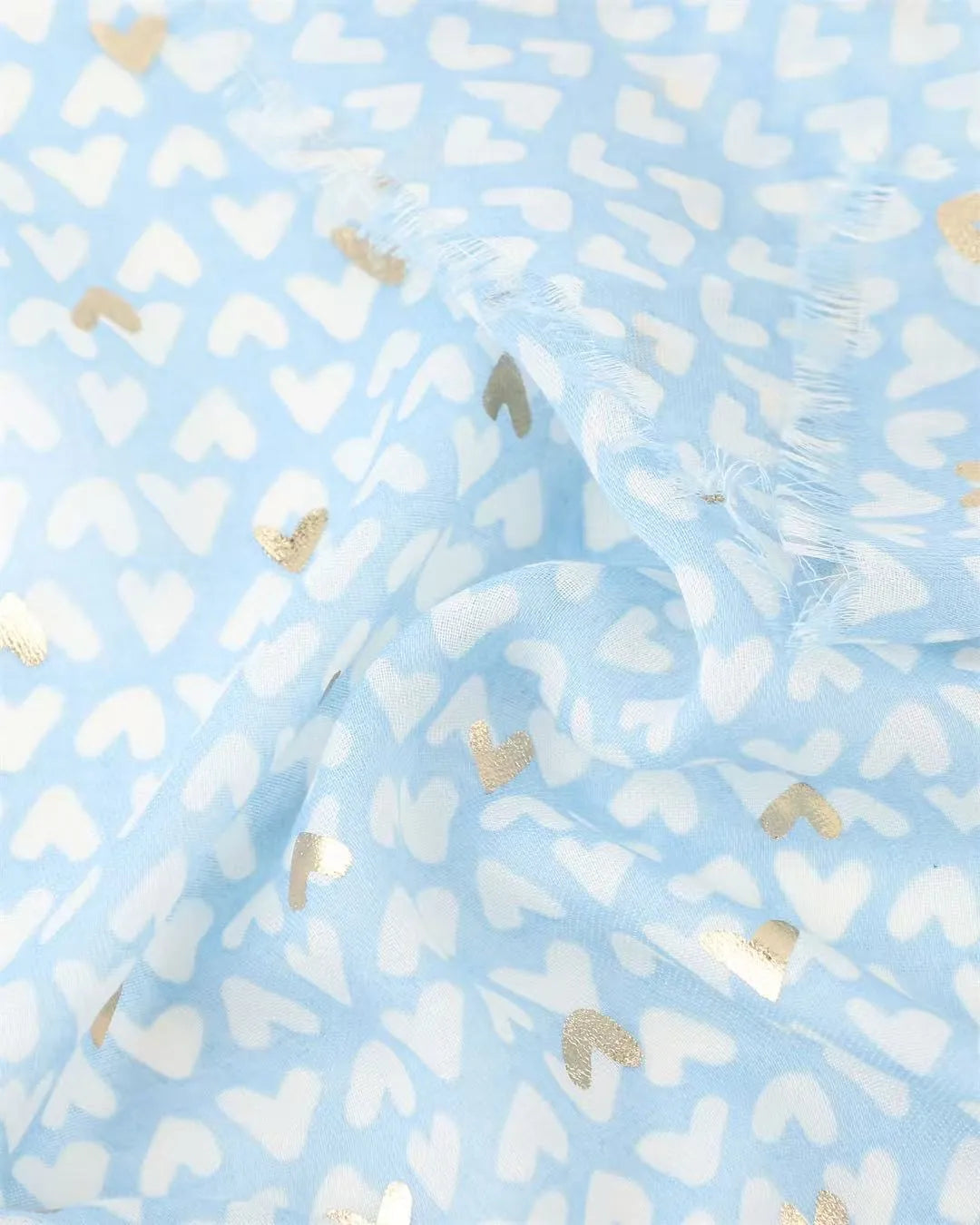 Soft, delicate, and a little bit dreamy – this lightweight summer scarf is covered in tiny white hearts on a pale blue background, with a sprinkling of metallic gold hearts scattered playfully throughout. Finished with softly frayed edges, it’s a pretty and feminine piece that adds a touch of sparkle to your everyday style.