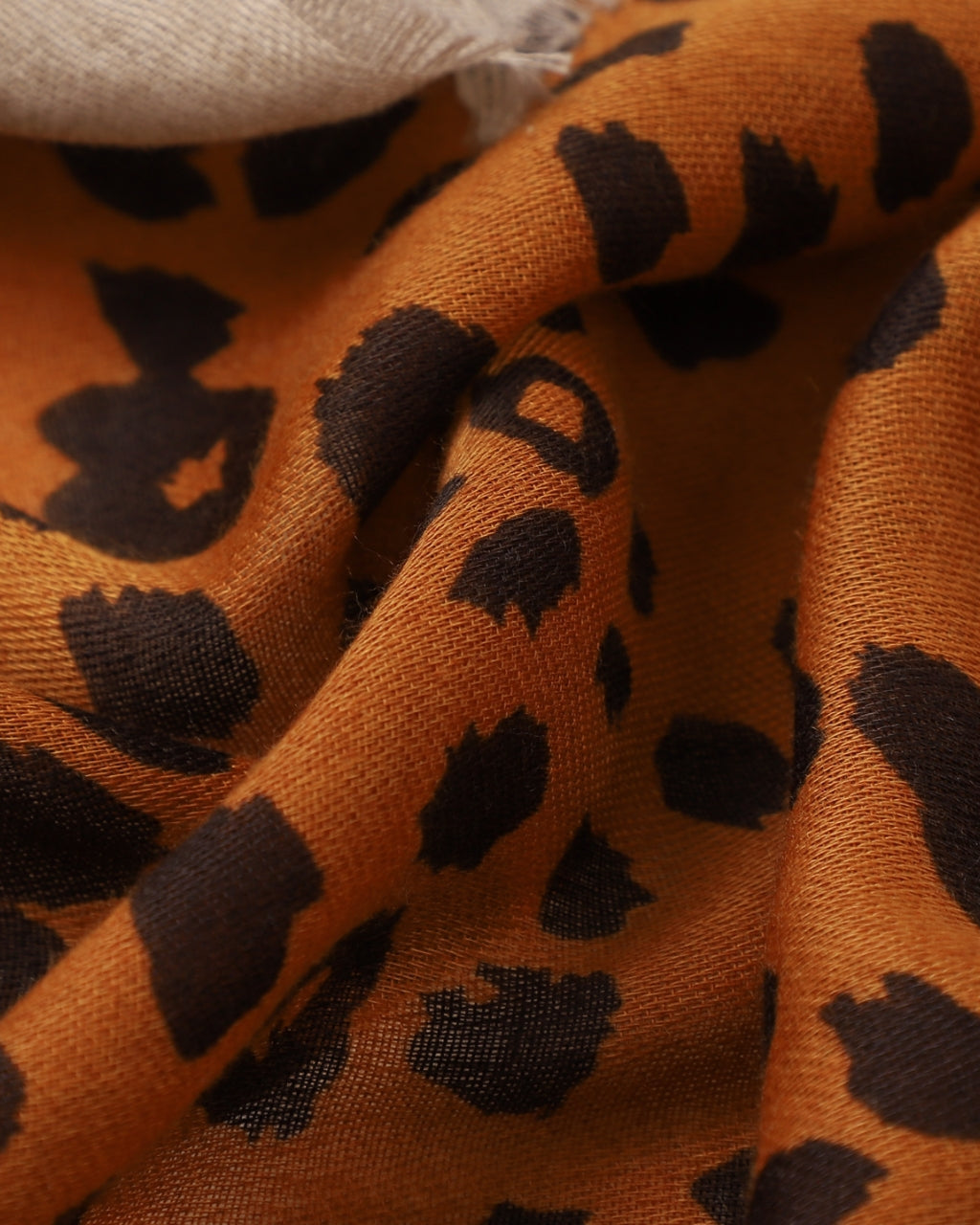 Unleash your wild side with Estelle! This bold autumn-winter scarf showcases a striking leopard pattern in black on a bronze background. Framed with a bold tan, brown and coral border and finished with softly fringed edges, Estelle is your perfect blend of fierce and fabulous. Add a pop of personality to your cool-weather wardrobe!