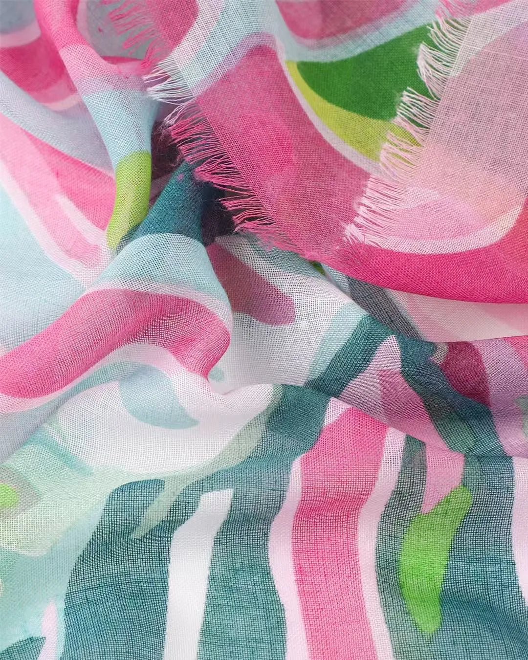 Add a splash of colour to your look with this lightweight summer scarf. Featuring a lively abstract pattern in pinks, greens, and aqua, it’s bright, playful, and full of fun. Finished with softly frayed edges, it’s the perfect piece to bring a cheerful pop to any outfit.