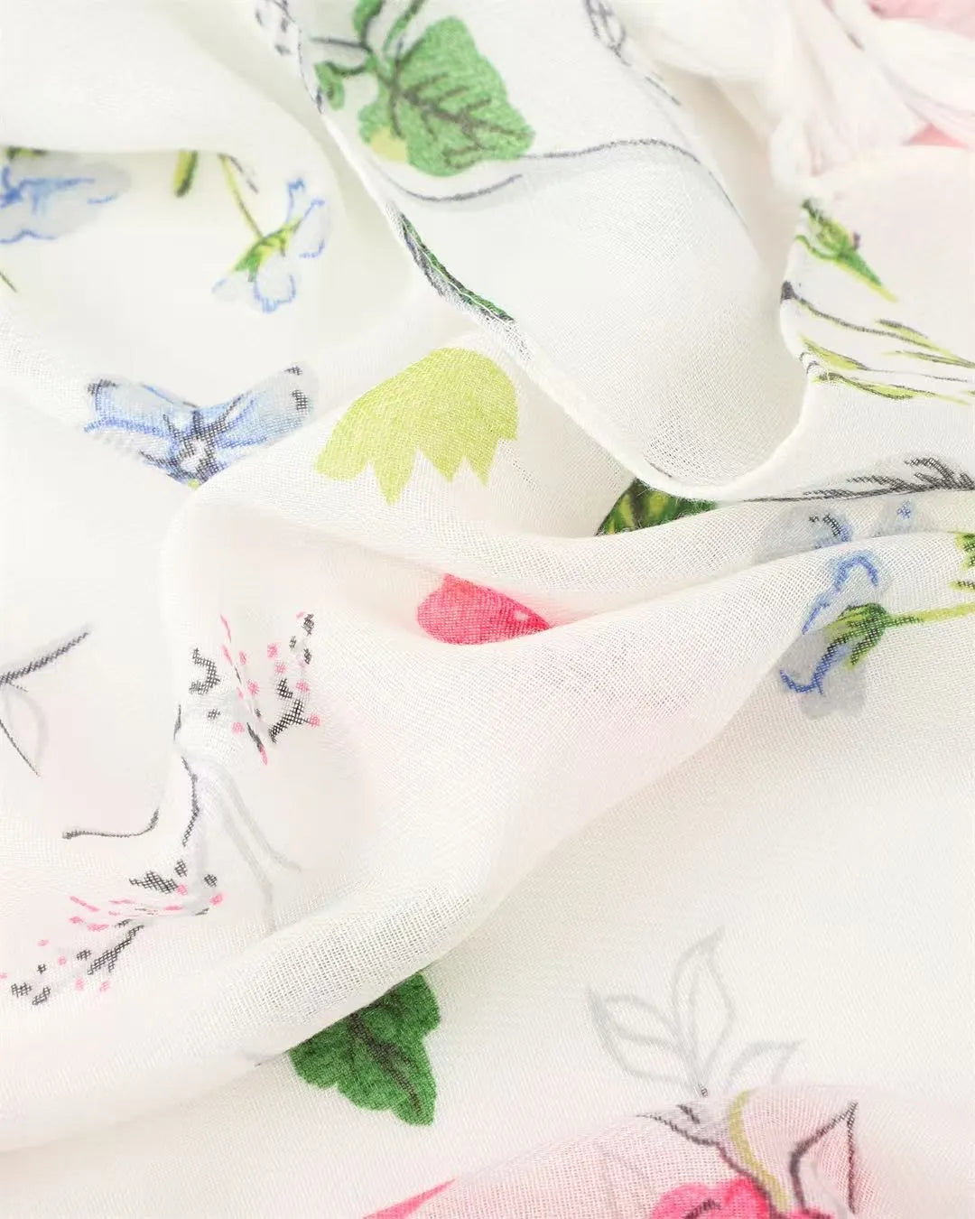 Like a stroll through an English country garden, this lightweight summer scarf is sprinkled with a delicate floral pattern in blue, pink, yellow, and green on a crisp white background. Finished with soft white tassels, its art-like design is pretty, fresh, and effortlessly charming – the perfect touch of summer romance for your wardrobe.