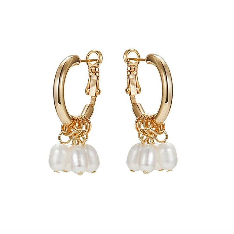 Elevate your style with our Gold Hoop Earrings! These 2cm x 3.5cm gold-plated hoops feature five charming freshwater pearls that gracefully dangle. Lightweight and elegant, they add a touch of sophistication to any look with ease!
