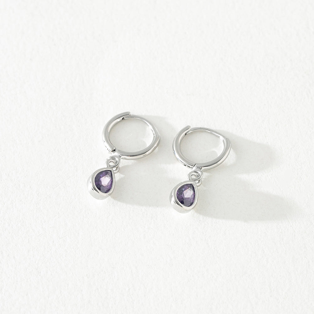 These minimalist hoops feature a tear drop amethyst (lilac) zircon gem, available in sterling silver or gold-plated sterling silver.