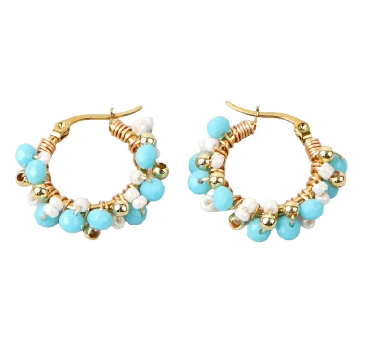 Add a touch of sweet elegance to your style with these baby blue, gold, and white beaded hoop earrings! Measuring a delicate 2.5 x 2.5 cm, they’re just the right size to make a statement without stealing the spotlight. Lightweight and oh-so-pretty, they bring a soft pop of colour that pairs effortlessly with any outfit, day or night.