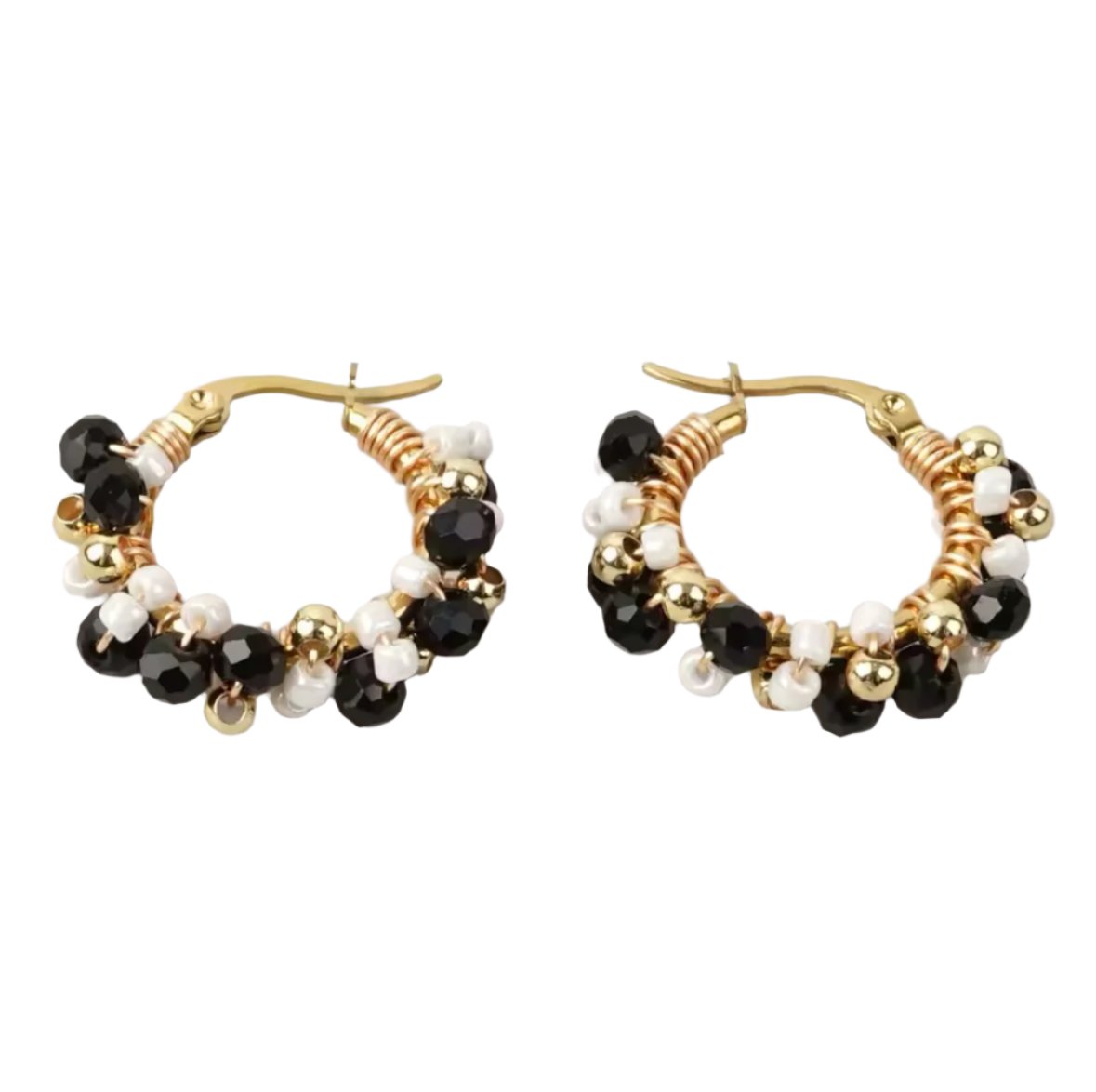 Add a touch of sweet elegance to your style with these black, gold, and white beaded hoop earrings! Measuring a delicate 2.5 x 2.5 cm, they’re just the right size to make a statement without stealing the spotlight. Lightweight and oh-so-pretty, they bring a soft pop of colour that pairs effortlessly with any outfit, day or night.