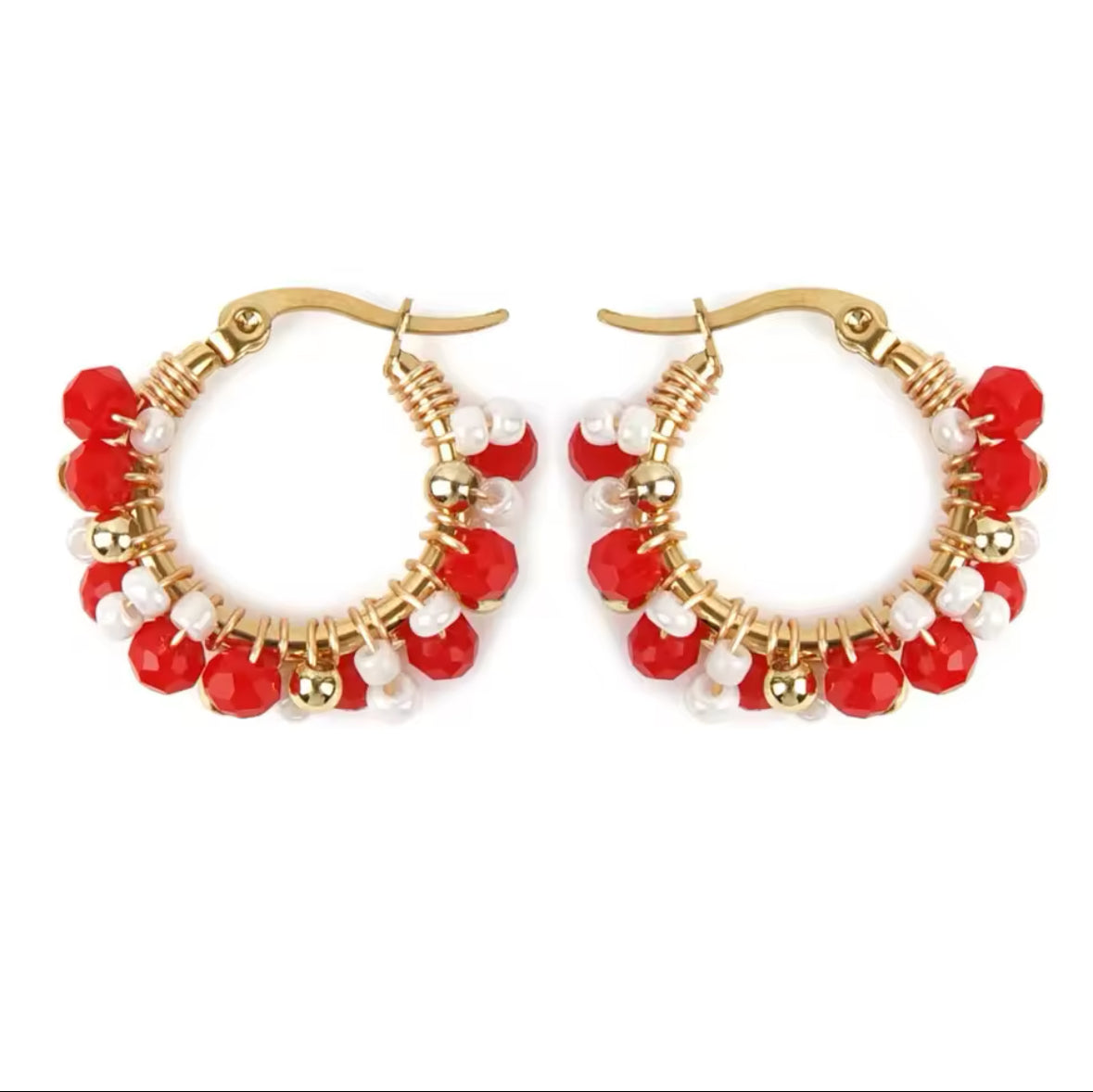 Add a touch of sweet elegance to your style with these red, gold, and white beaded hoop earrings! Measuring a delicate 2.5 x 2.5 cm, they’re just the right size to make a statement without stealing the spotlight. Lightweight and oh-so-pretty, they bring a soft pop of colour that pairs effortlessly with any outfit, day or night.