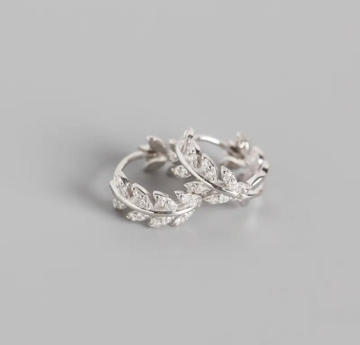 These minimalist hoops feature a leaf pattern with crystal embellishments, available in gold plated stering silver as well as these sterling sterling.