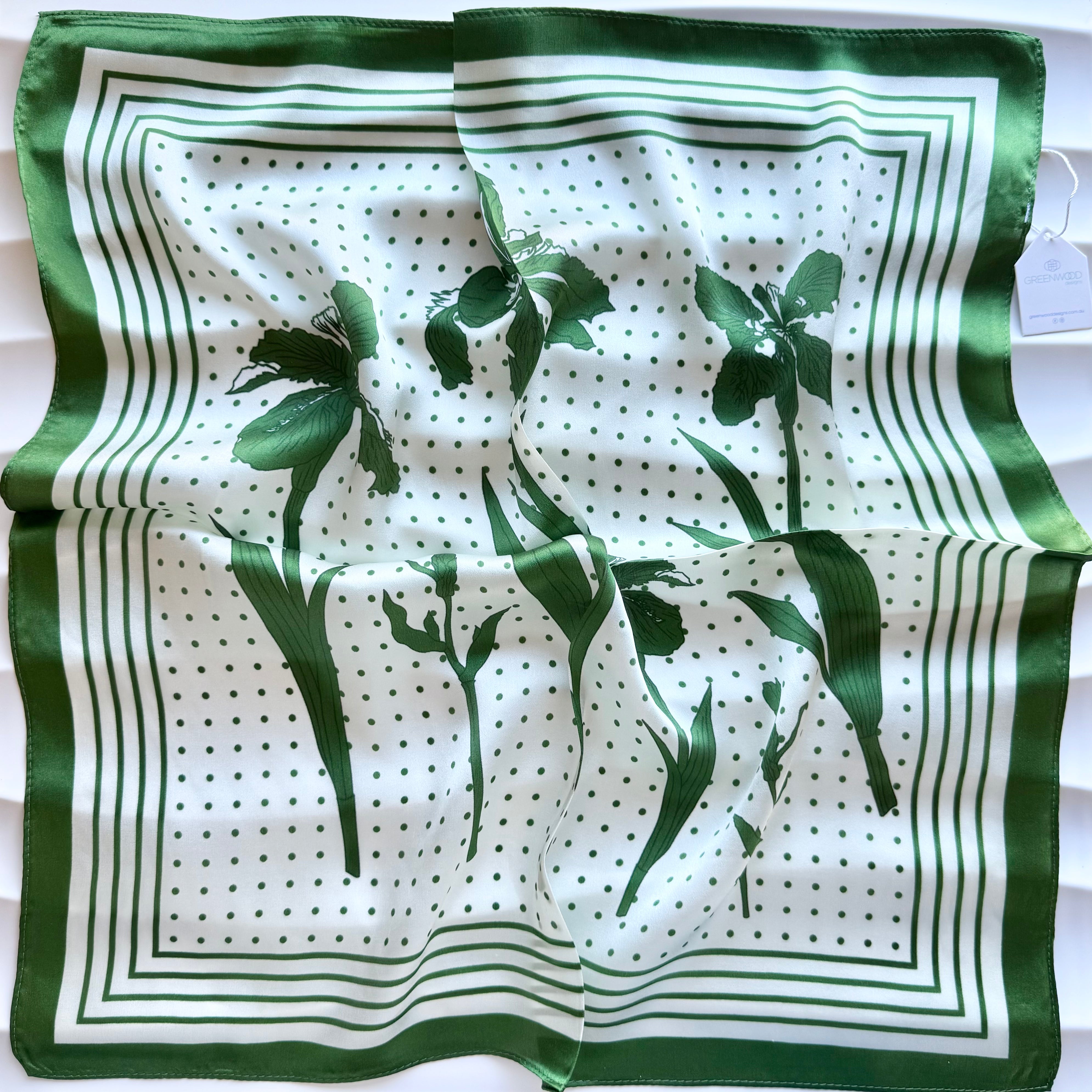 Add a playful splash of colour to any outfit with the Lily Spot Neck Scarf. Crafted from soft, lightweight 100% silk and measuring 53cm, this charming scarf features a cream base adorned with emerald green spots, a delicate lily print, and a bold emerald border. Tie it around your neck, wrist, or bag for an instant style boost. Perfectly sized and easy to send, it makes a delightful gift or a fun treat just for you!