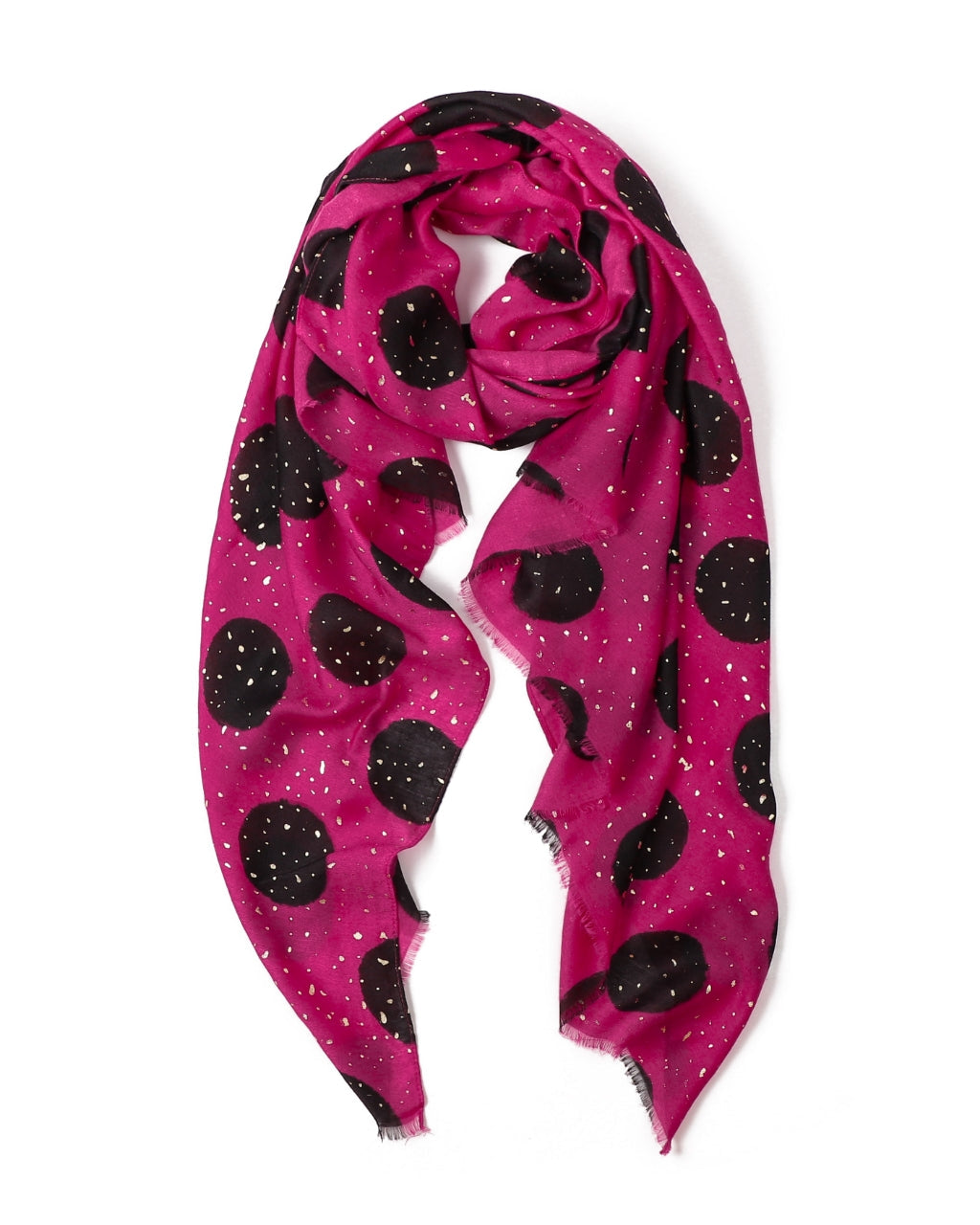 Say hello to Odette, the scarf that knows how to make a statement! Her bold black spots pop against a rich deep pink background, while a touch of gold foil detail adds a dash of glamour. Finished with softly fringed edges, Odette is perfect for those who love a little drama and a lot of style in their autumn-winter wardrobe.