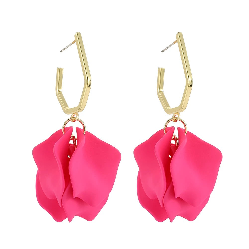 Add a touch of elegance and playfulness to your outfit with these earrings. The gold hoops and hot pink resin petals create a stunning contrast, while remaining lightweight for all-day wear. Elevate your style with these unique and gorgeous earrings!