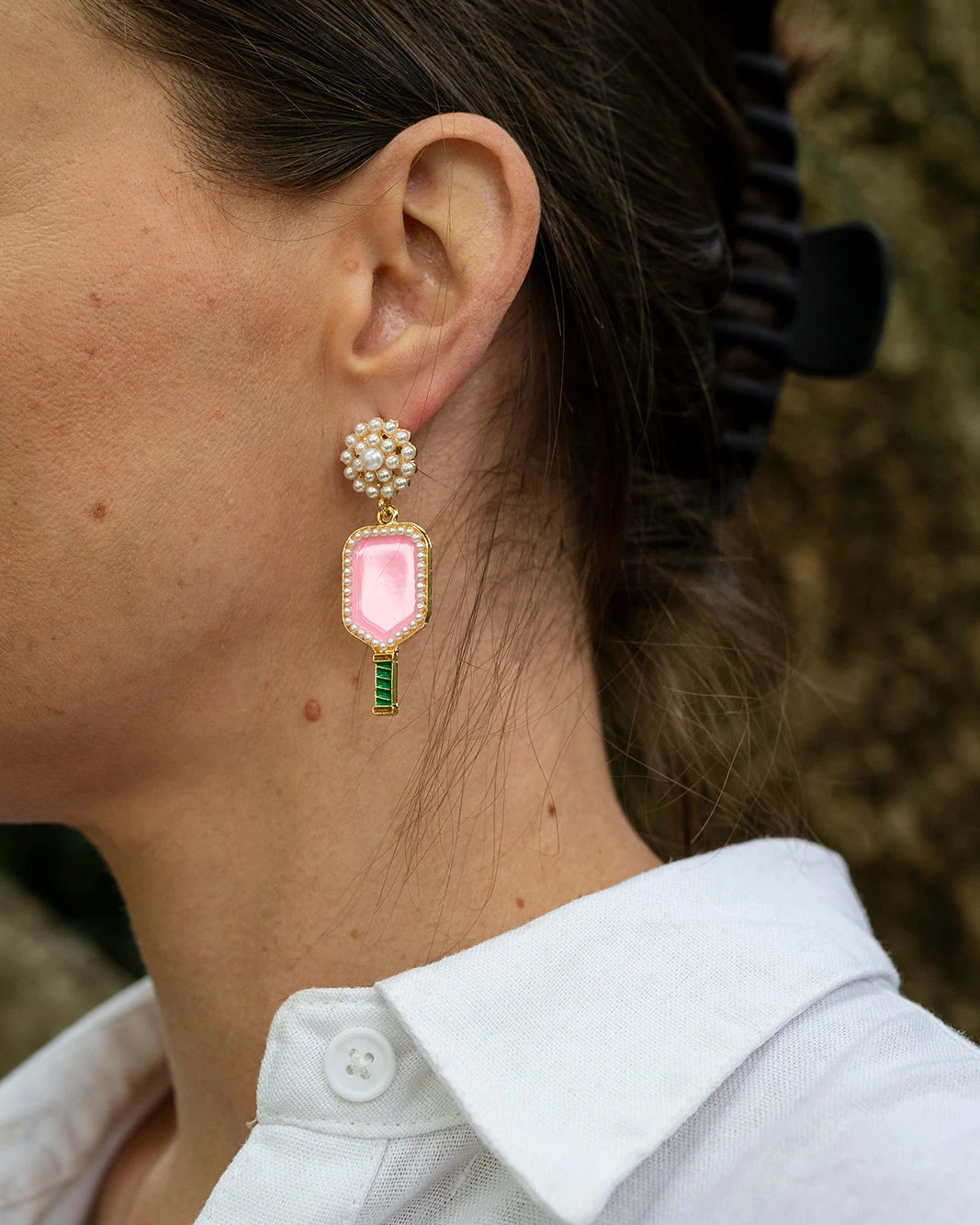 The Jorja earrings serve up a playful twist on sporty style! Mini faux pearls form the ‘ball’ stud, while a pink enamel pickleball bat dangles below. Fun, quirky, and totally out-of-the-box — perfect for pickleball fans or anyone who loves earrings with a cheeky sense of humour.