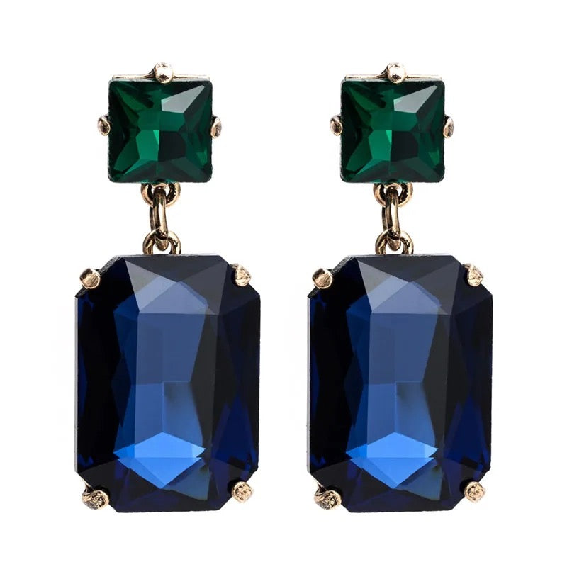 Fancy some bling to jazz up your little black dress or even that top and jeans combo? Well this earring features a stunning emerald gemstone, set in a classic and elegant design that highlights its beauty. Below the emerald gemstone, a deep navy blue gemstone hangs delicately, adding a touch of sophistication and depth to the piece. The earring is designed to dangle gracefully from the earlobe, making it a perfect accessory to add a touch of glamour and sophistication to any outfit. The deep green and navy blue hues of the gemstones create a striking contrast, making this earring a truly eye-catching piece of jewellery. Also available in black (medium bling 028) and yes, as seen on Edwina Bartholomew!