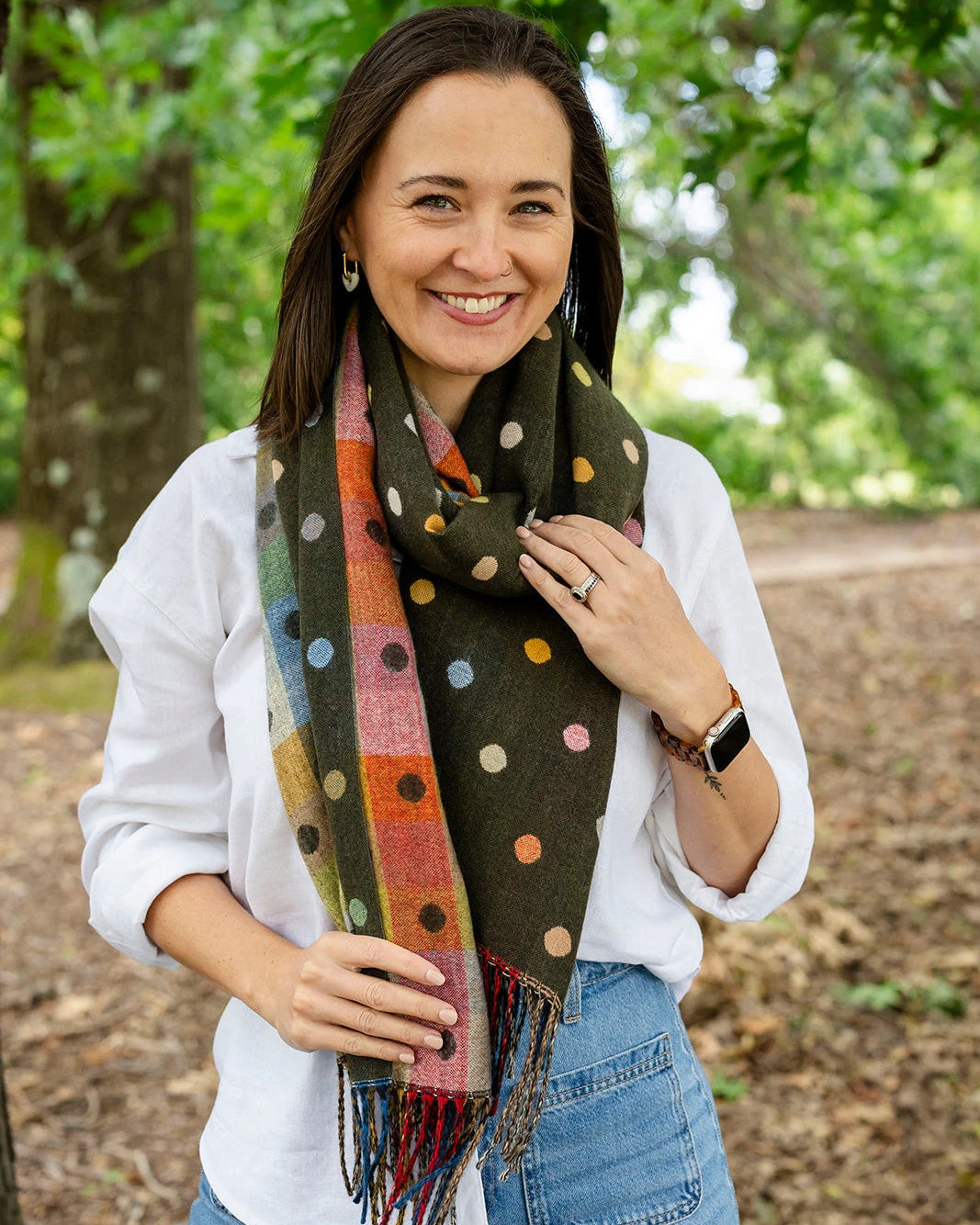 Spotty Dotty is a winter-weight polyester scarf in a warm, dark green base, dotted with beautifully bright spots in pink, yellow and blue. Sheโs irresistibly buttery-soft to the touch and finished with long, multi-coloured tassels for a little extra fun. Turn her over and youโll find a clever reverse โ a checked pattern with spots tucked inside โ giving you two stylish looks in one.