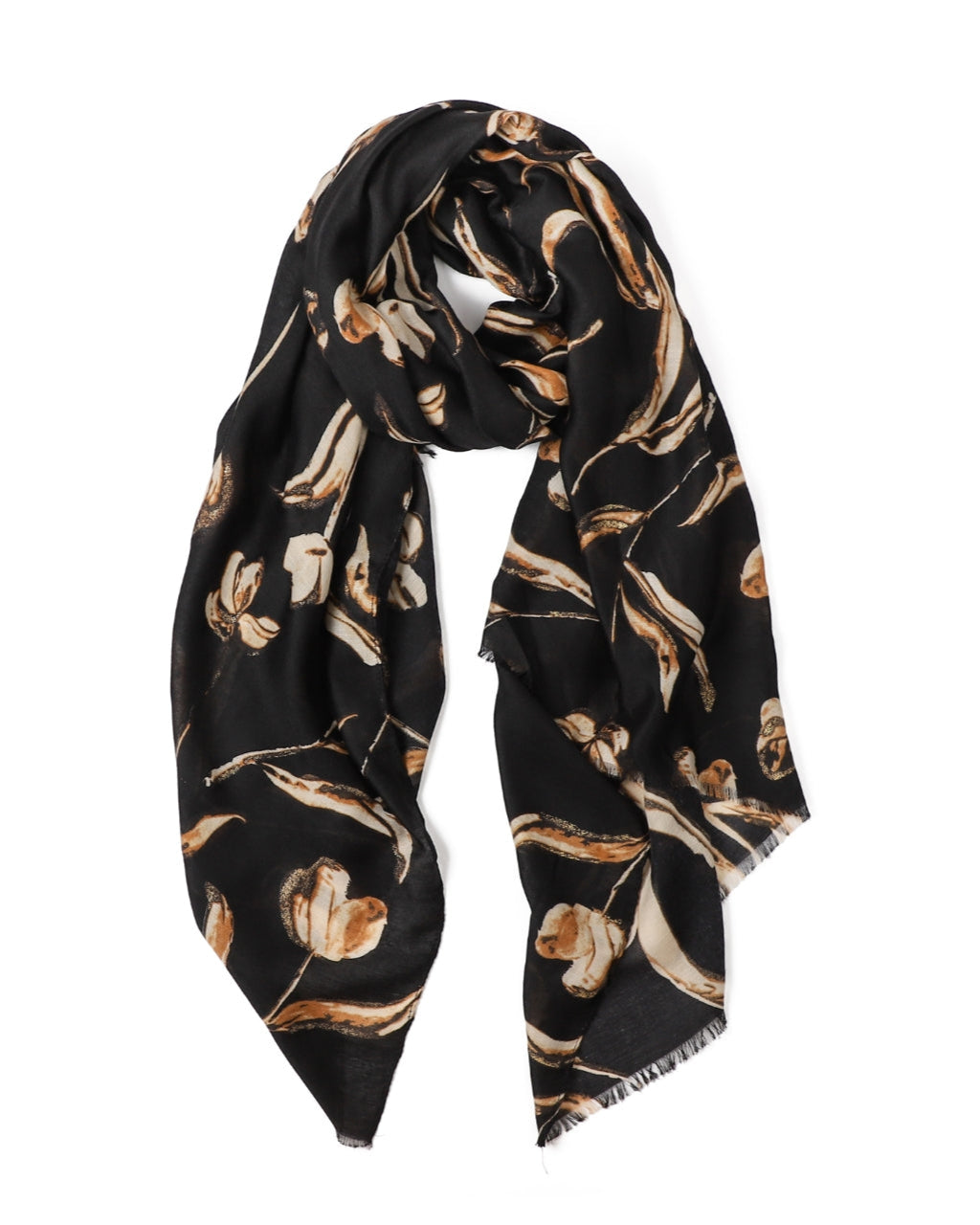 Meet Tessa, the scarf that’s as striking as it is sophisticated! With her bold, large-scale tulip print in cream and black set against a black background, she’s the perfect statement piece for spring and summer. A touch of gold detailing adds just the right amount of sparkle, while softly fringed edges keep things effortlessly chic. Wrap up in Tessa and let your style bloom!